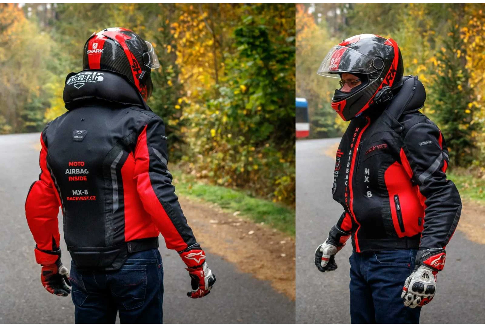 Spúšťací mechanizmus vesty na hrudníku je spojený s motocyklom pružným karbónovým lankom