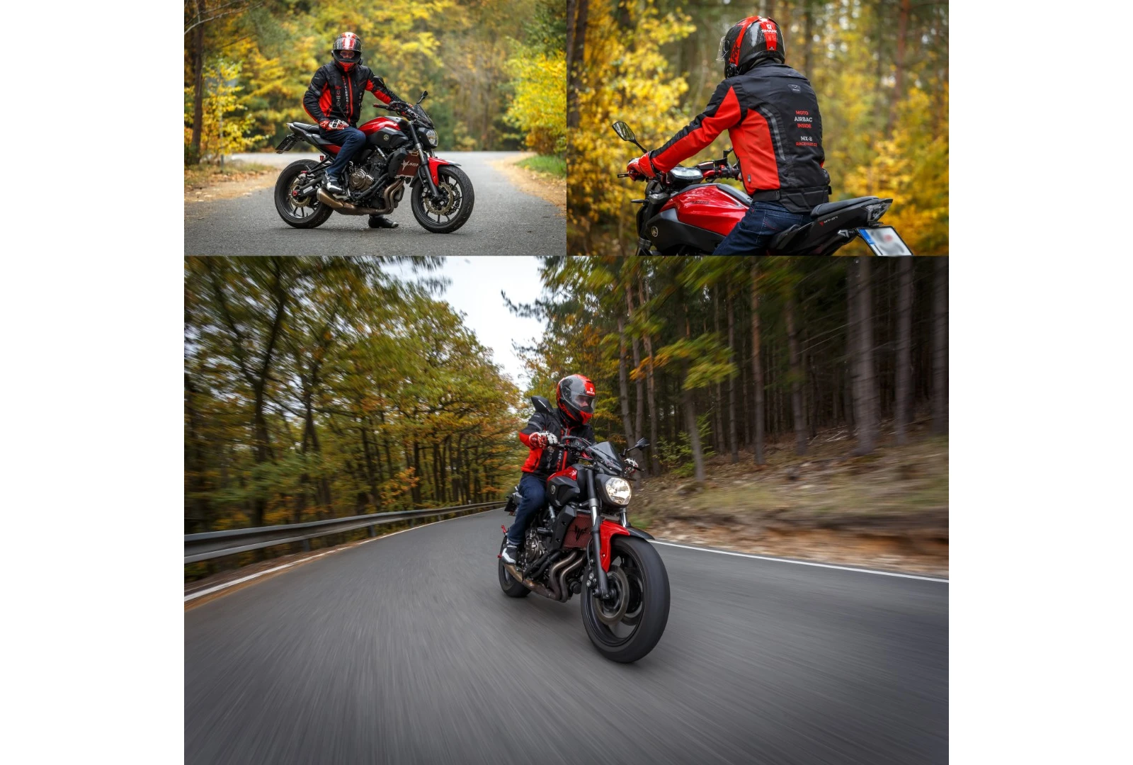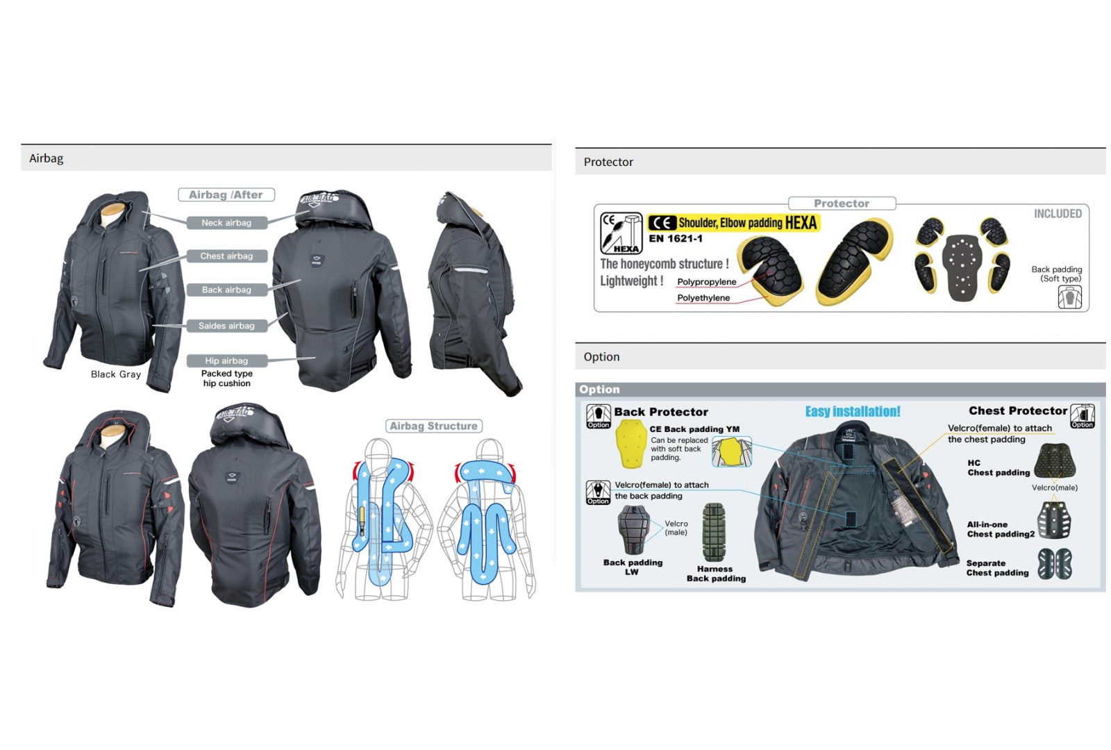 Voliteľne možno dokúpiť CE certifikovaný chrbtový, či hrudnej protektor, ktoré ešte viac zvýšia úroveň Vašej ochrany v okamihu pádu alebo kontaktu s časťami motocykla ako sú riadidlá, nádrž, atď.