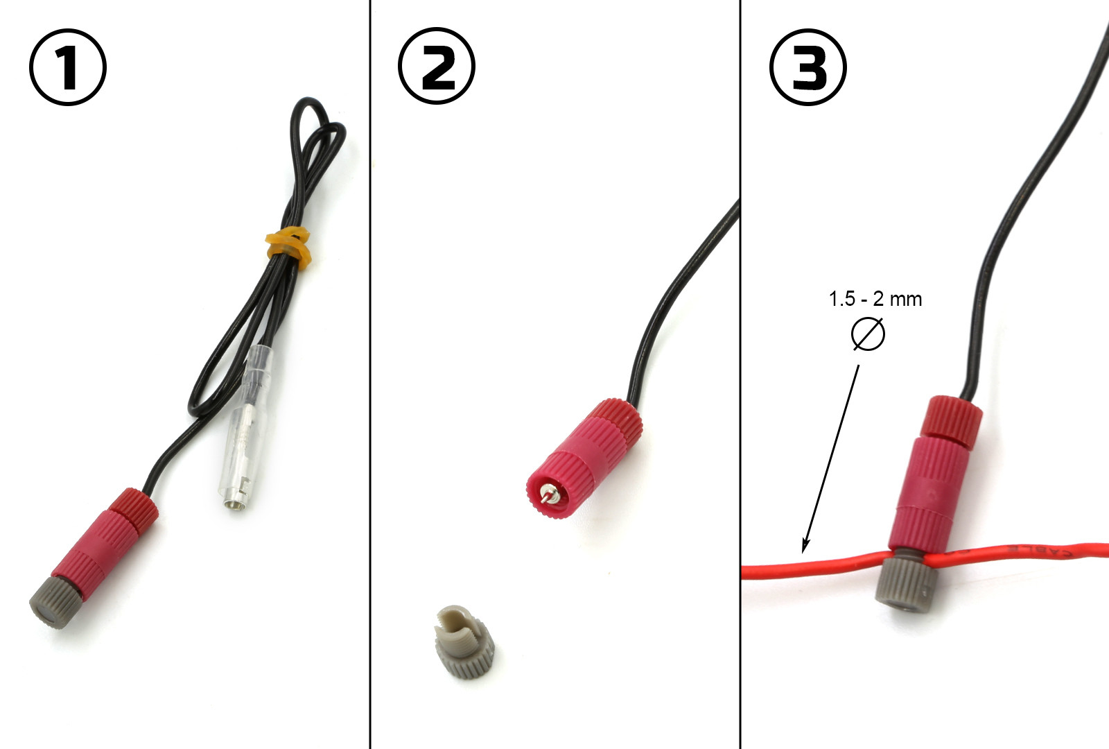 - Naskrutkujte na šedý kryt priebojné koncovky s káblom červenou priebojnú koncovku s predlžujúcim káblom a uistite sa, že je pripojený kábel pevne fixovaný.