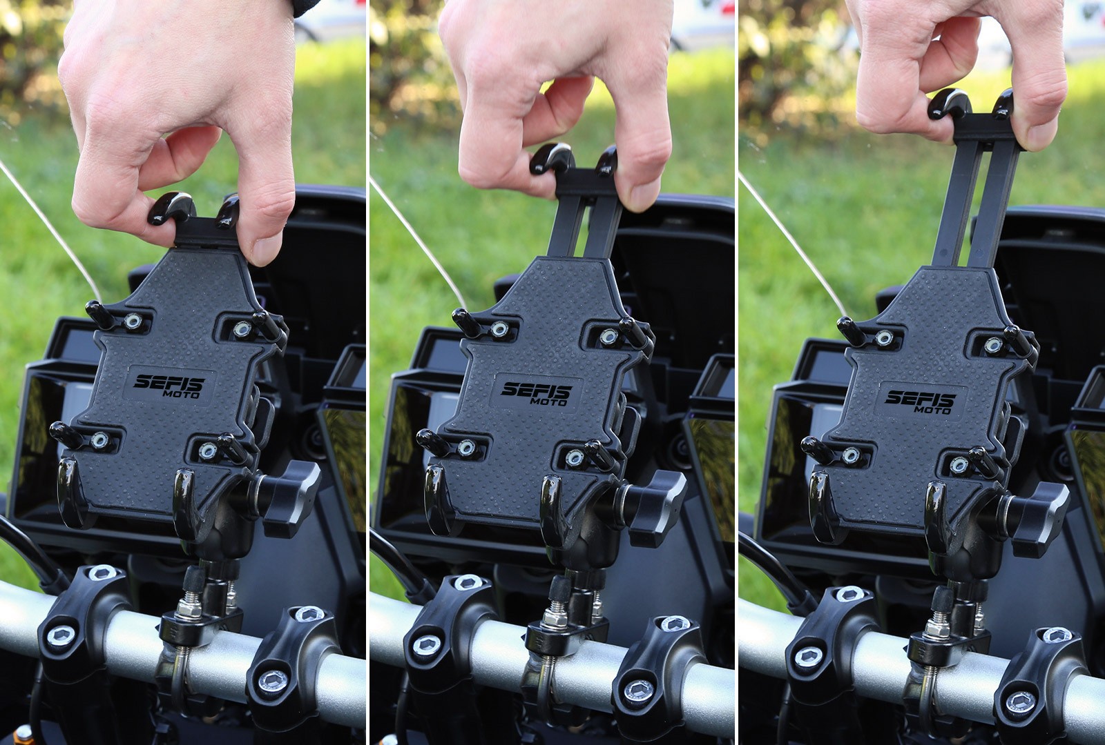 Variabilná montážka vám umožní nastaviť si polohu držiaka telefónu presne tak, ako potrebujete, držiak ide natočiť a sklopiť do všetkých smerov a samozrejmosťou je aj 360 ° rotácie. Pre zmenu nastavenia navyše stačí iba povoliť ručnú skrutku na tele nohy montážky, to je veľmi jednoduché aj v rukaviciach a tak nie je problém rýchlo montážku povoliť a držiak otočiť pokiaľ napríklad preferujete horizontálne zobrazovanie navigácie.