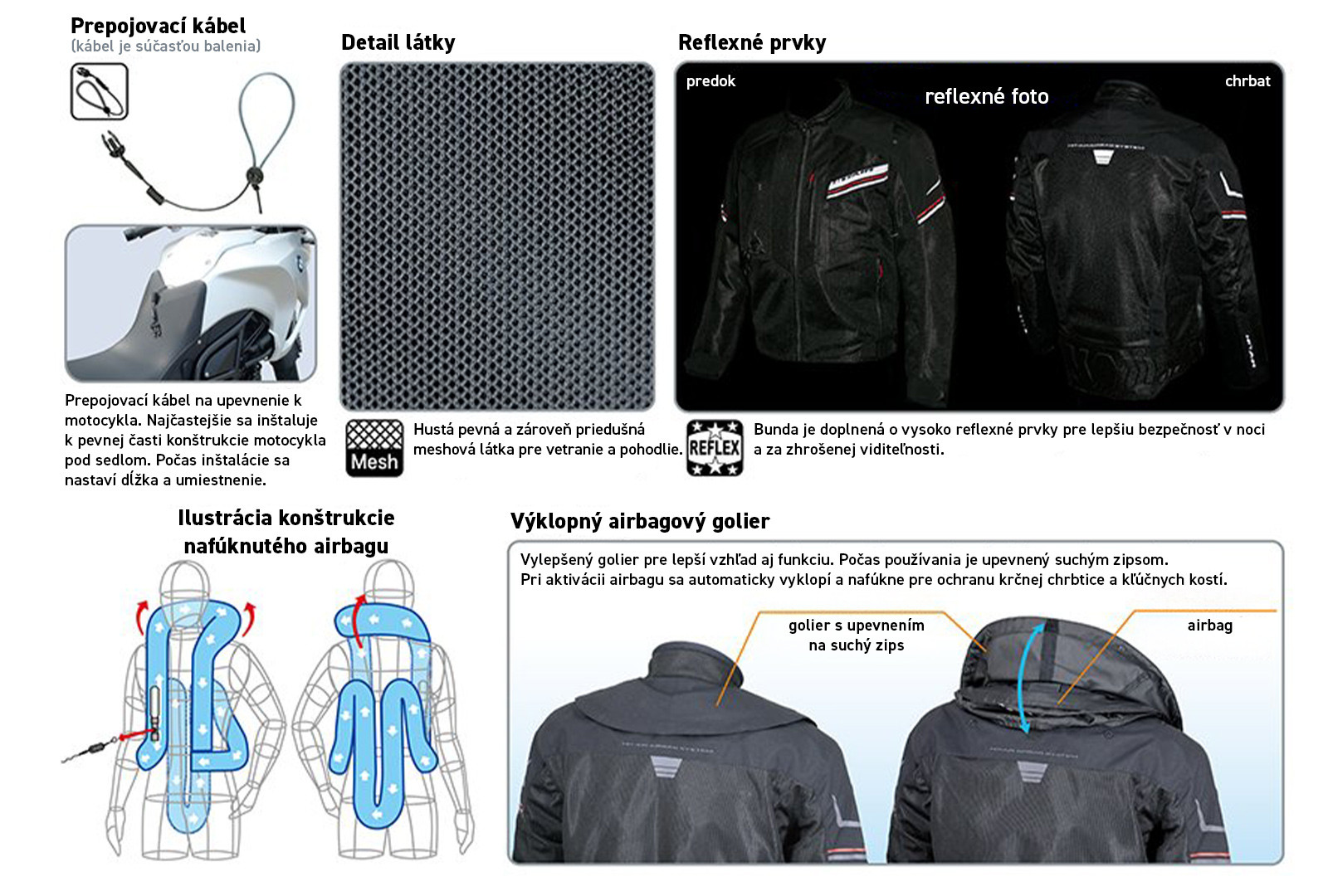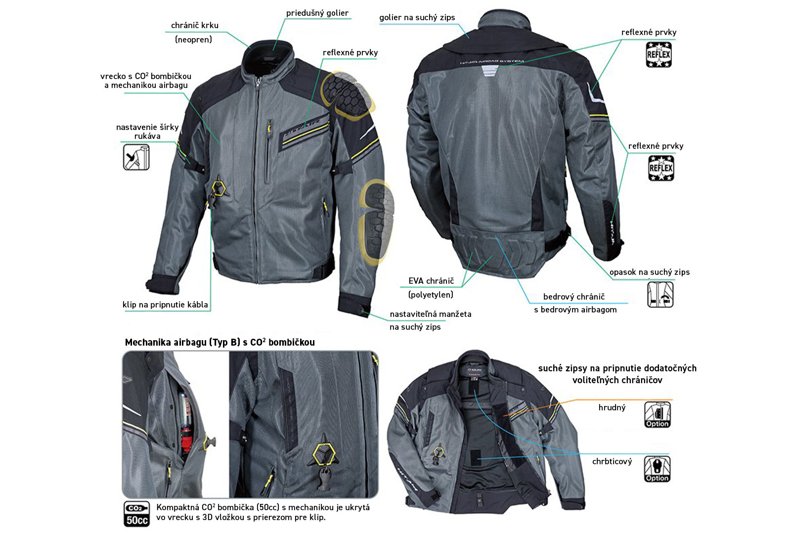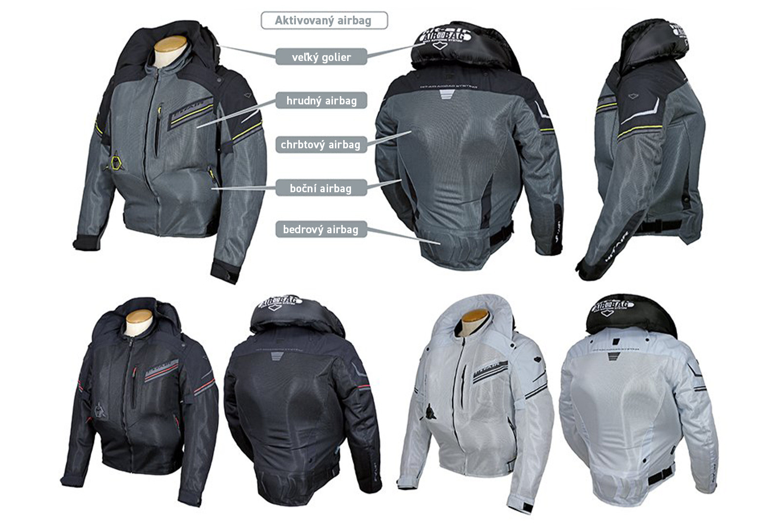 Airbag sa aktivuje vylepšenou trhacou mechanikou a je opätovne použiteľný. Okrem airbagu je bunda vybavená mäkkým chrbticovým chráničom s vetracími prierezmi a aj špičkovými HEXA chráničmi ramien a lakťov, ktoré sú ľahké a ohybné. Tieto chrániče je potom možné doplniť hneď niekoľkými ďalšími dokúpiteľnými chráničmi. Za zmienku stojí aj oproti predchádzajúcej verzii predĺžený vystužený chránič kostrče.