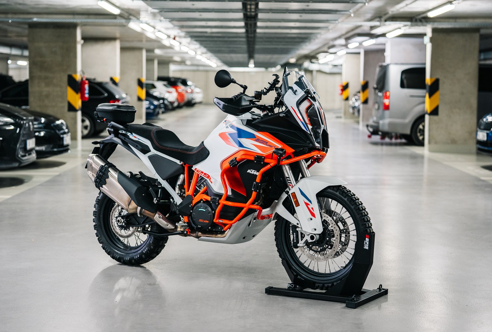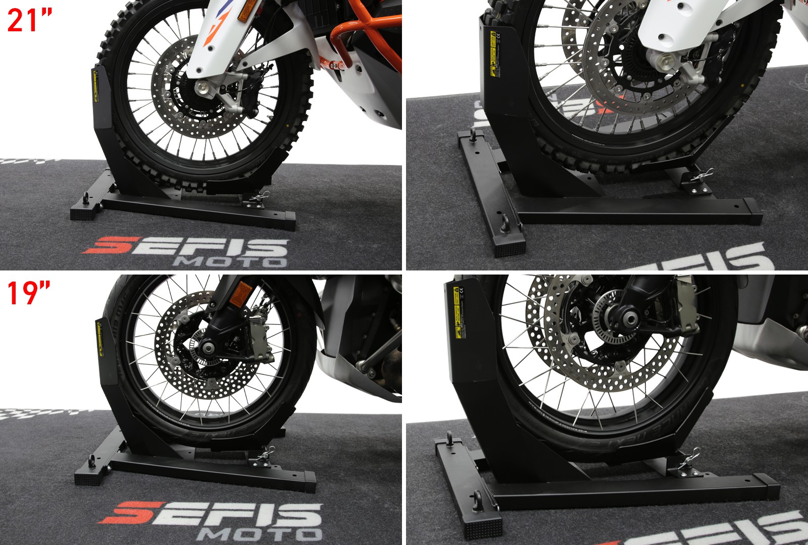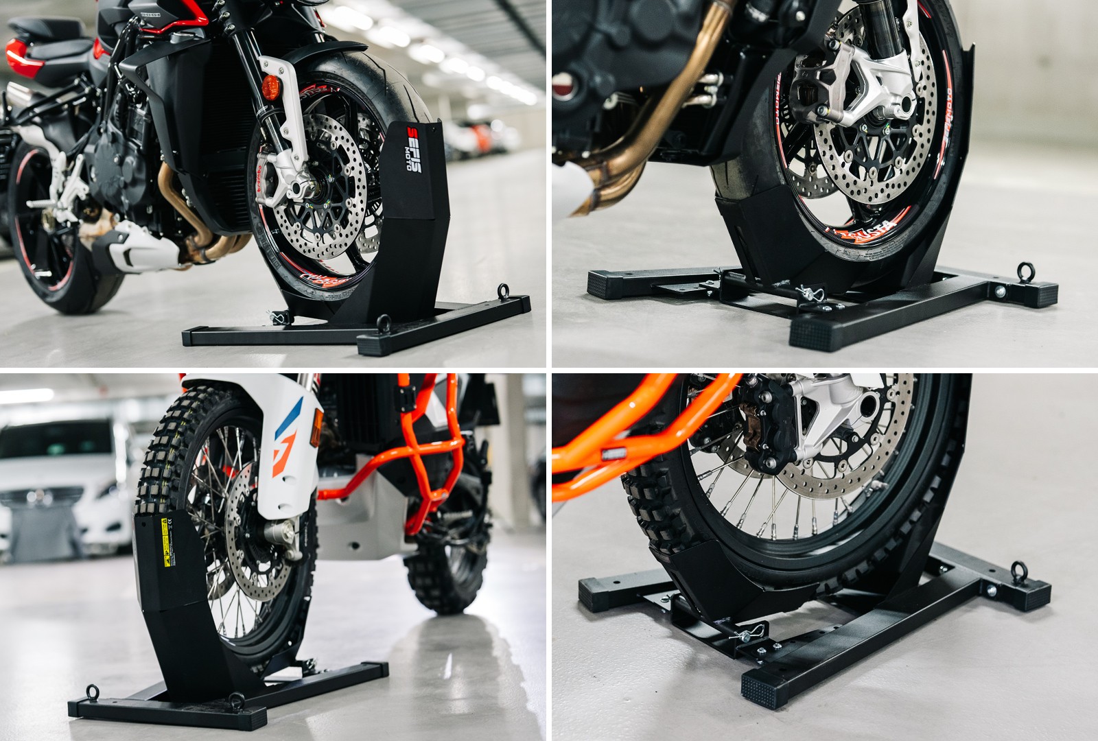 Na zakotvenie stojana do podlahy dodávky, prívesu alebo garáže slúžia štyri otvory o veľkosti 10 milimetrov. Zakotvenie stojana nielen zaručí dokonalú stabilitu a bezpečie vášho motocykla počas prepravy, ale tiež vám umožní využiť dvojicu ôk s vnútorným priemerom 20 milimetrov slúžiacu na pretiahnutie prepravných popruhov a fixáciu motocykla priamo k stojanu. Pre ich využitie je ale nutné pevné zakotvenie stojana, pri nezakotvenom stojane vždy fixujte motocykel k bodom k tomu určeným vo vnútri vozidla.