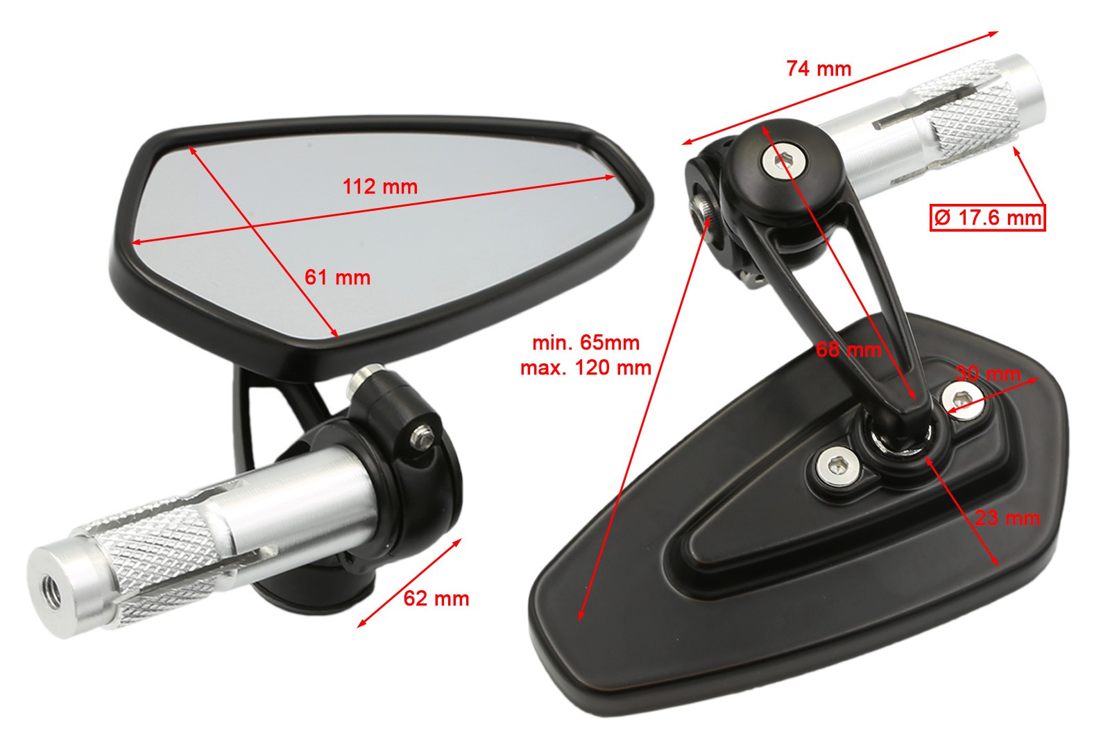 Zrcátka Flip dodávame s montážou pre inštaláciu do koncov riadidiel v štýle cafe racer. Takto umiestnené zrkadlá sú čoraz populárnejšie, či už vďaka lepšiemu výhľadu dozadu alebo atraktívnejšiemu vzhľadu riadidiel. Na inštaláciu do riadidiel poslúži univerzálna montáž pre riadidlá s vnútorným priemerom 13-17 milimetrov a hodí sa napríklad pre riadidlá Honda, Suzuki a mnoho ďalších. V našej ponuke nájdete aj ďalšie varianty produktu s montážami pre originálne riadidlá Yamaha a Kawasaki s vnútorným závitom.