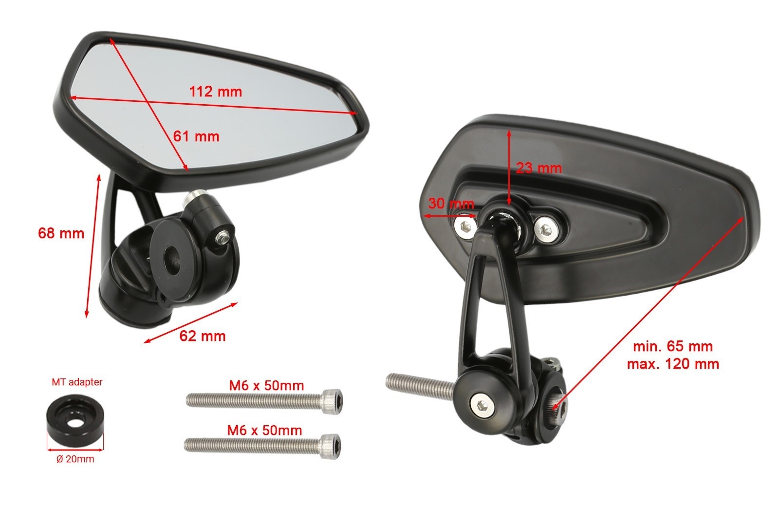 Zrcátka Flip dodávame s montážou pre inštaláciu do koncov riadidiel v štýle cafe racer. Takto umiestnené zrkadlá sú čoraz populárnejšie, či už vďaka lepšiemu výhľadu dozadu alebo atraktívnejšiemu vzhľadu riadidiel. Na inštaláciu do riadidiel poslúži univerzálna montáž pre riadidlá s vnútorným priemerom 13-17 milimetrov a hodí sa napríklad pre riadidlá Honda, Suzuki a mnoho ďalších. V našej ponuke nájdete aj ďalšie varianty produktu s montážami pre originálne riadidlá Yamaha a Kawasaki s vnútorným závitom.