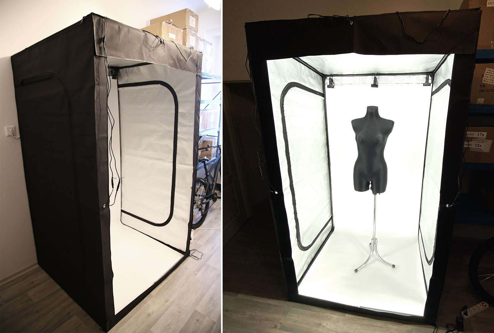Fotostan alebo tiež fotobox slúži k perfektnému nasvietenie a nafotenie objektu. Je osvetlený hneď ôsmich ľad pásky s neutrálnou farbou svetla ktoré možno zapojiť do štyroch samostatných plynule nastaviteľných adaptérov. Jednoducho tak možno nastaviť silu svetla osobitne pre každú stranu fotoboxu. Fotobox je vyrobený z odolných nerezových lakovaných tyčí a možno ho opakovane rozložiť a zložiť, veľmi jednoduchý proces ktorý jednému človeku zaberie zhruba 30-40 minút. Súčasťou stanu sú hneď tri odolná PVC plátna slúžiace ako pozadie v bielej, čiernej a bledo modrej farbe. Možno ho používať ako postavený tak položený pre fotenie rozmerných predmetov. Fotostan tejto veľkosti sa hodí pre fotenie malých i veľkých predmetov, postáv, portrétov, oblečenie atď. Tento typ fotostan používame pre fotenie naprostej väčšiny produktov SEFIS a preto si výsledky môžete prezrieť na akékoľvek našej úvodnej produktovej fotografii. Fotostan dodávame zabalný v praktickej prenosnej taške.
