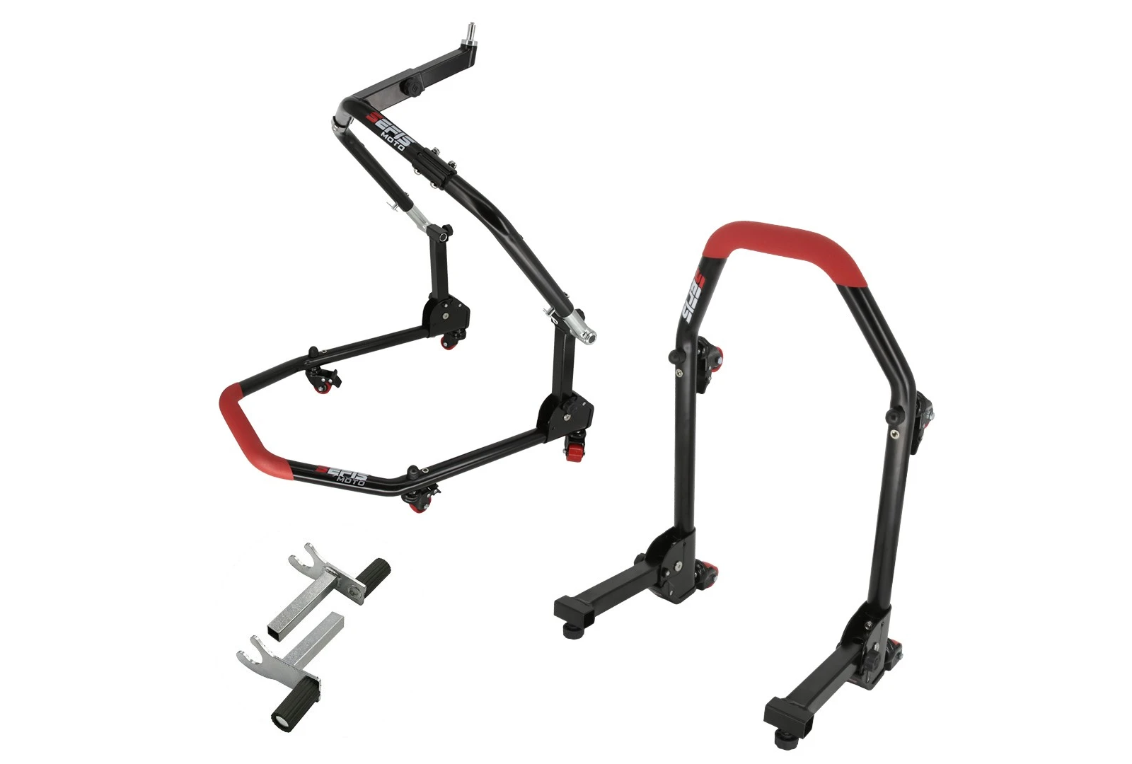 Pri zadnom stojane máte na výber z troch typov adaptérov: Háky pre motocykle s rolnami, packy pre motocykle, ktoré treba zdvíhať priamo za kyvnú vidlicu a 2v1 ktoré je možné zároveň použiť ako single predné adaptéry pre motocykle s radiálnymi brzdičmi. Pre nastavenie šírky stojana sú adaptéry polohovateľné do strán a pokiaľ by aj to bolo pre nezvyčajne úzke alebo široké motocykle málo, samotný stojan je možné opretím o zem rukami stlačiť alebo roztiahnuť až o ďalších 5 centimetrov bez toho, aby došlo k akémukoľvek poškodeniu.