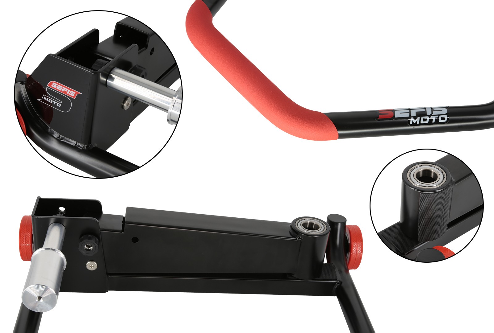 Rovnako ako u ostatných moderných stojanov SEFIS je aj u M22 samozrejmosťou ergonomické pogumované madlo. To nielen dobre vyzerá, ale umožní pevný a spoľahlivý úchop ideálny na pohodlné zdvihnutie motocykla. Okrem pohodlia je madlo aj protišmykové pre lepšiu bezpečnosť zvlášť pri použití napríklad v dielni alebo pri čistení reťaze s postriekanými rukami alebo v rukaviciach.